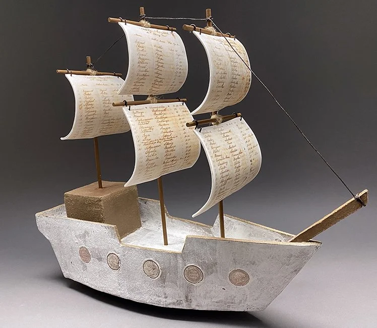 I was moved to create a ceramic ship when in May 2020, the National Archives of Trinidad and Tobago released the images of the manifest of the Fattel Rozack, the first ship to carry Indians from Calcutta to Trinidad as indentured labourers in 1845. The sails are porcelain cast in firebrick and the boat is stoneware, with images of period coins from India and the British West Indies.